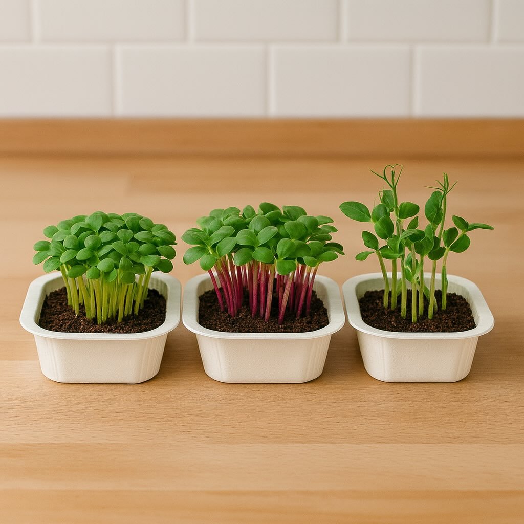 Tři nejrychlejší microgreens do začátku: Řeřicha, Ředkvička a Rukola. Rychlé klíčení, výrazná chuť a 100% kompostovatelný Biopap obal. První sklizeň obvykle za 2–5 dní.